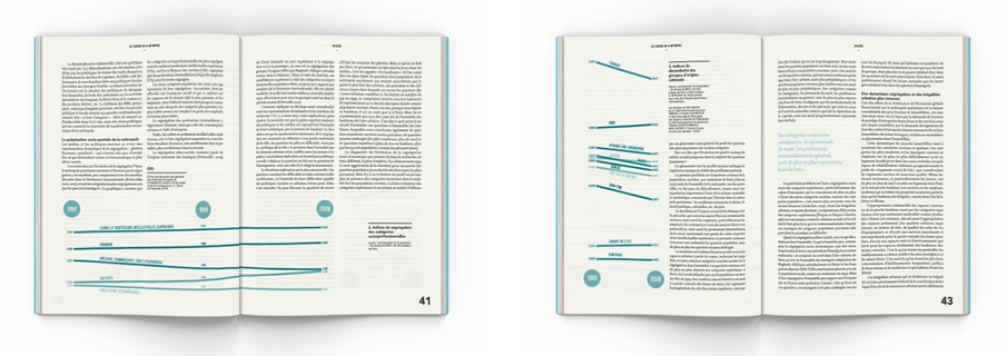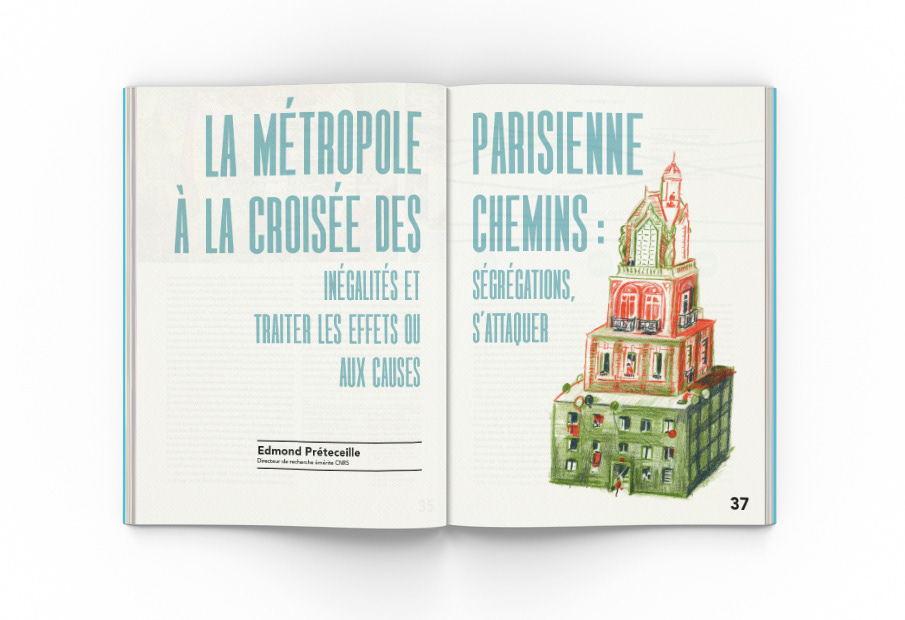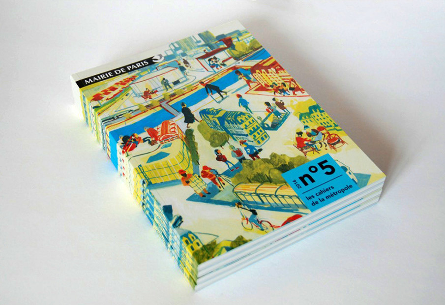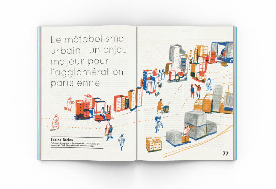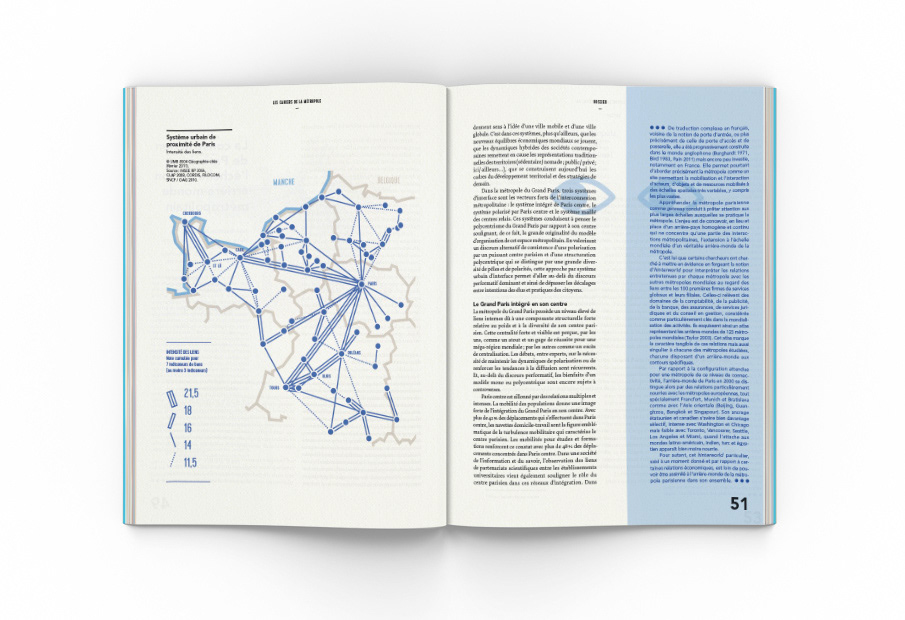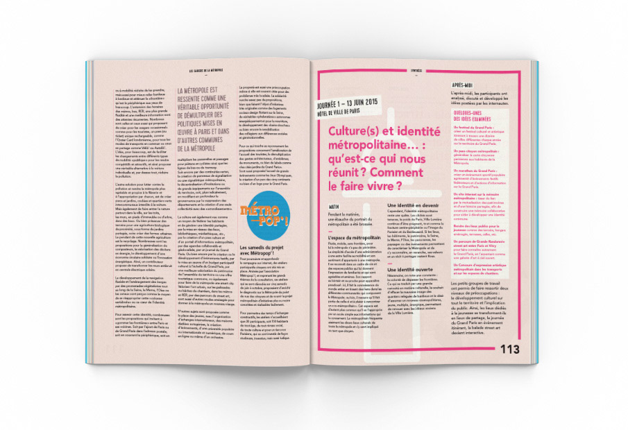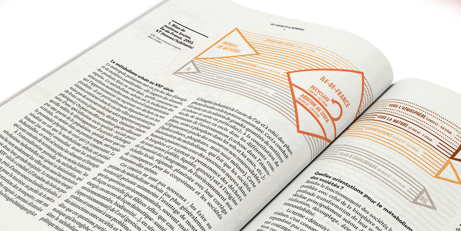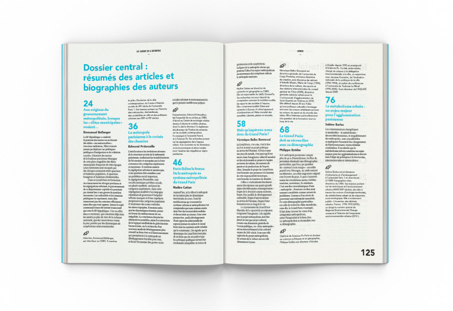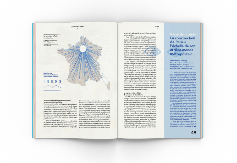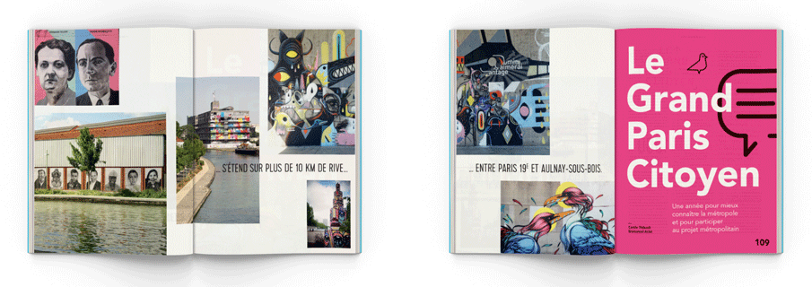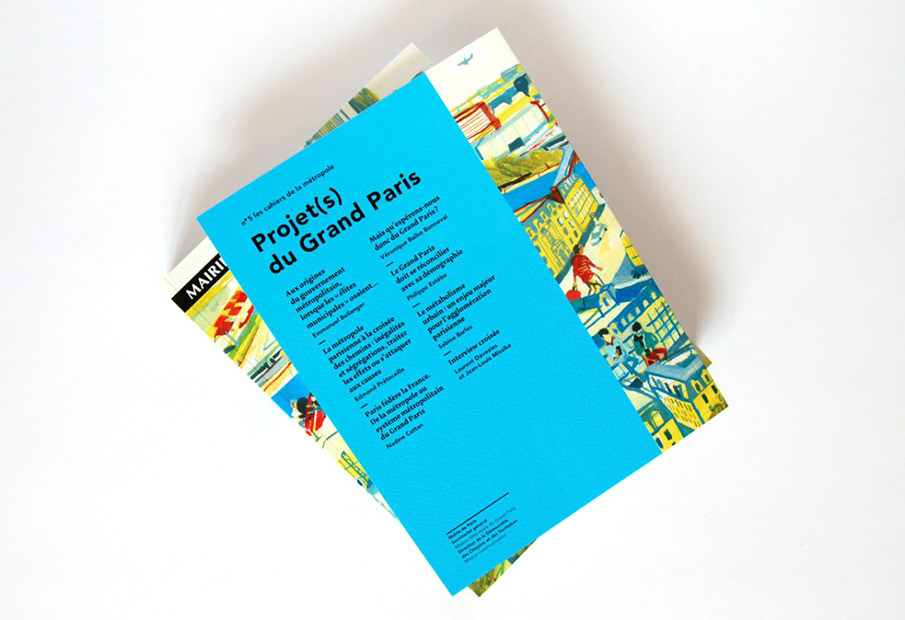 Pour ce numéro coïncidant avec le lancement de la Métropole du Grand Paris, l’atelier a totalement repensé la maquette des cahiers avec une approche éditoriale de type “mook” (magazine/book). Une large place donnée aux illustrations et aux graphiques, un choix de papiers adapté aux différentes parties de l’ouvrage, et des détails de mise en page soignés donnent un caractère pérenne à la publication qui devient un ouvrage de référence, à conserver pour s’y référer dans le temps.