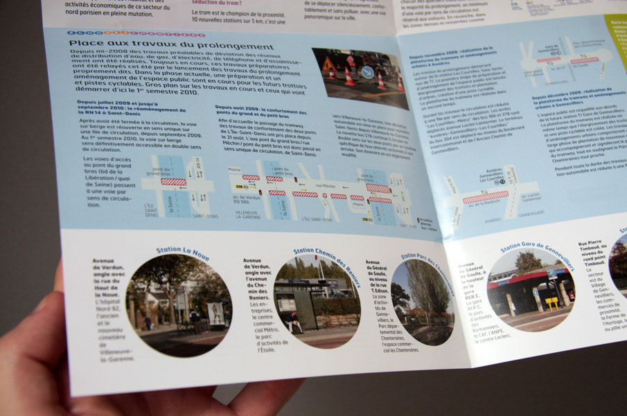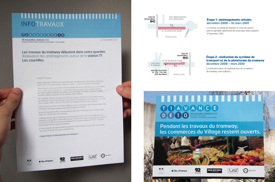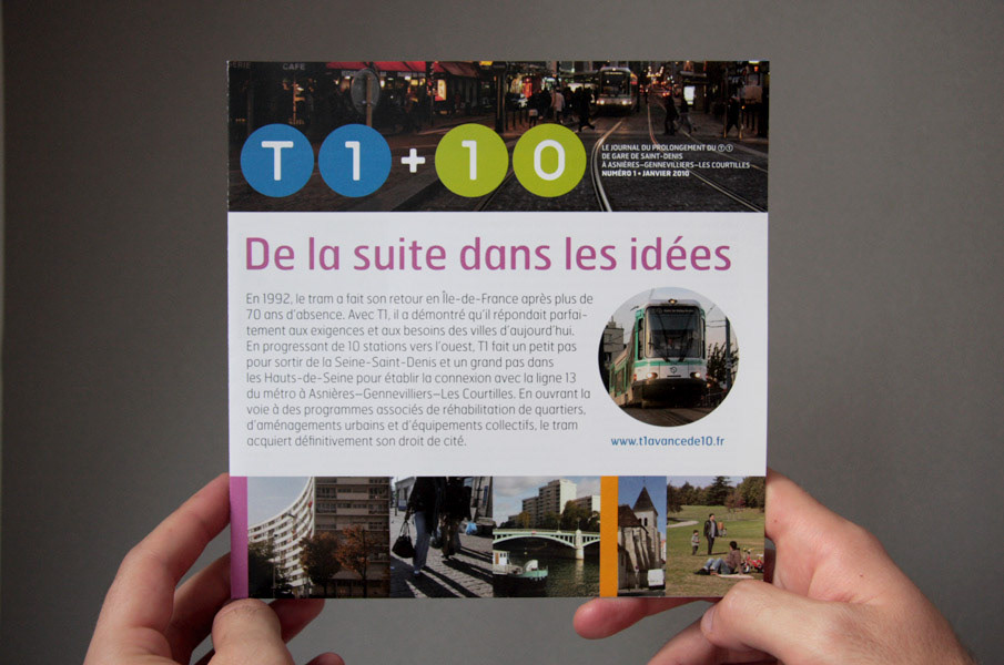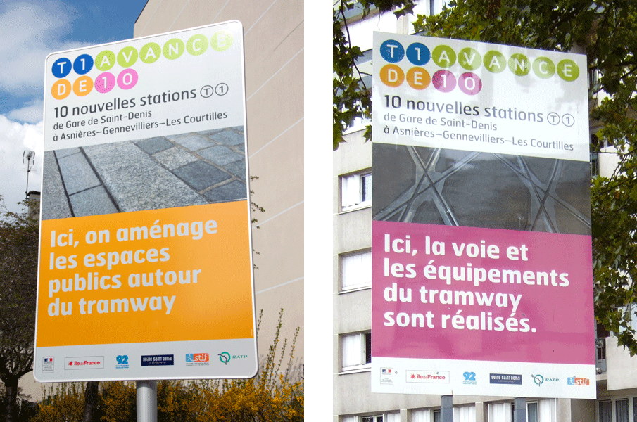 De Saint-Denis à Asnières-Gennevilliers-Les Courtilles, la ligne 1 du tramway gagne 10 stations : dénomination simple du projet et référence opportune à l’univers du jeu. Le tram va transformer les villes qu’il desservira, pendant les travaux des couleurs gaies et un ton entraînant jalonnent l’espace des chantiers et illuminent les boîtes aux lettres. Projet d’envergure, de la conception de l’identité graphique aux multiples applications en édition, web et sur site à la fois pour la communication institutionnelle et la communication de perturbation autour des chantiers.
